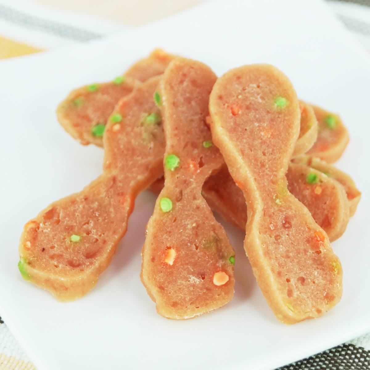 鶏肉(胸肉、ササミ)、小麦粉、にんじん、ほうれん草、ソルビトール、グリセリン、プロピレングリコール、ミネラル類(ナトリウム)、リン酸塩(Na)、酸化防止剤(ビタミンE)、発色剤(亜硝酸ナトリウム)、着色料(赤102、赤106、黄4、黄5、青1)