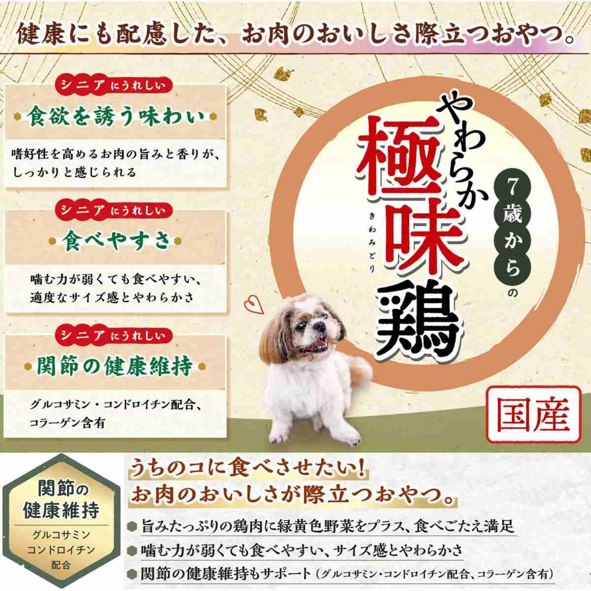 シニア犬の健康にも配慮した、お肉のおいしさ際立つおやつ。緑黄色野菜入り。