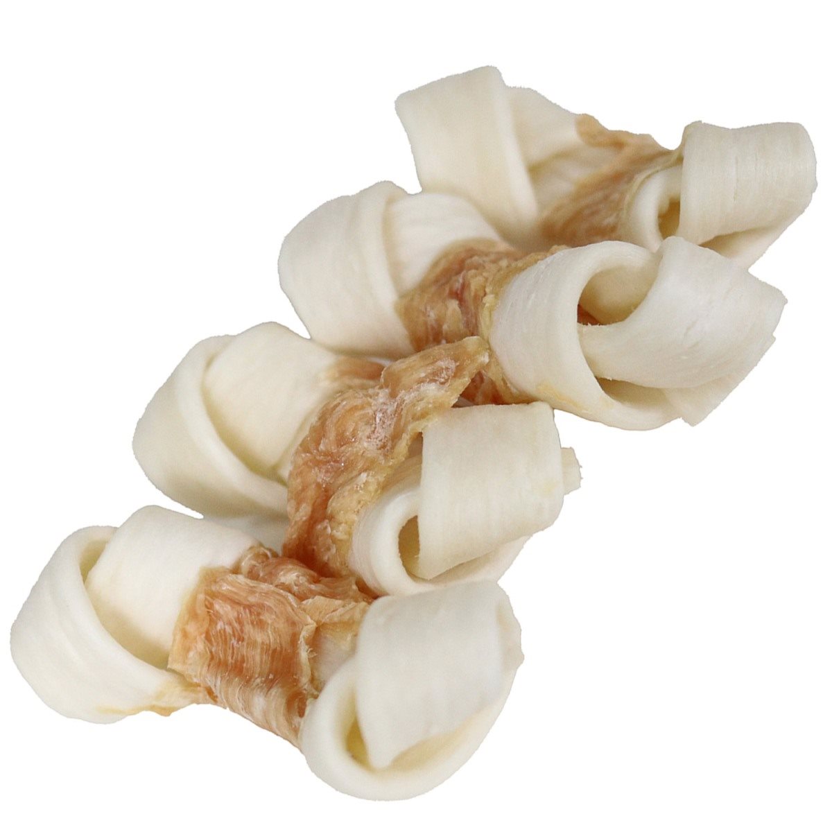 ガムが苦手なワンちゃんに、おいしく長く噛めるガムを作りました。骨型ミニガムに胸肉を巻きました。