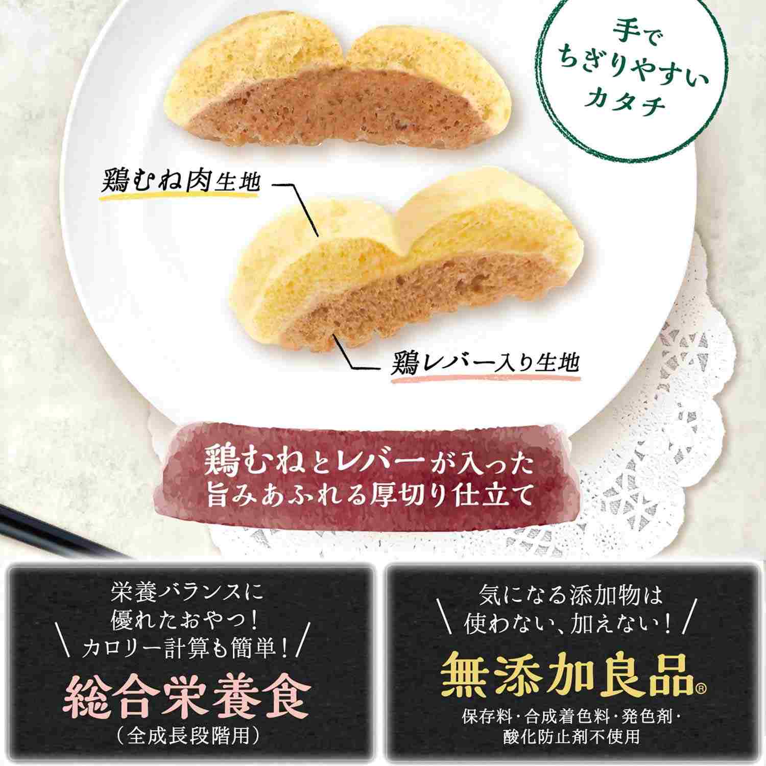 鶏むね肉と鶏レバーが入った2層の異なる味わい。旨みあふれる厚切り仕立て。総合栄養食基準のおやつ。