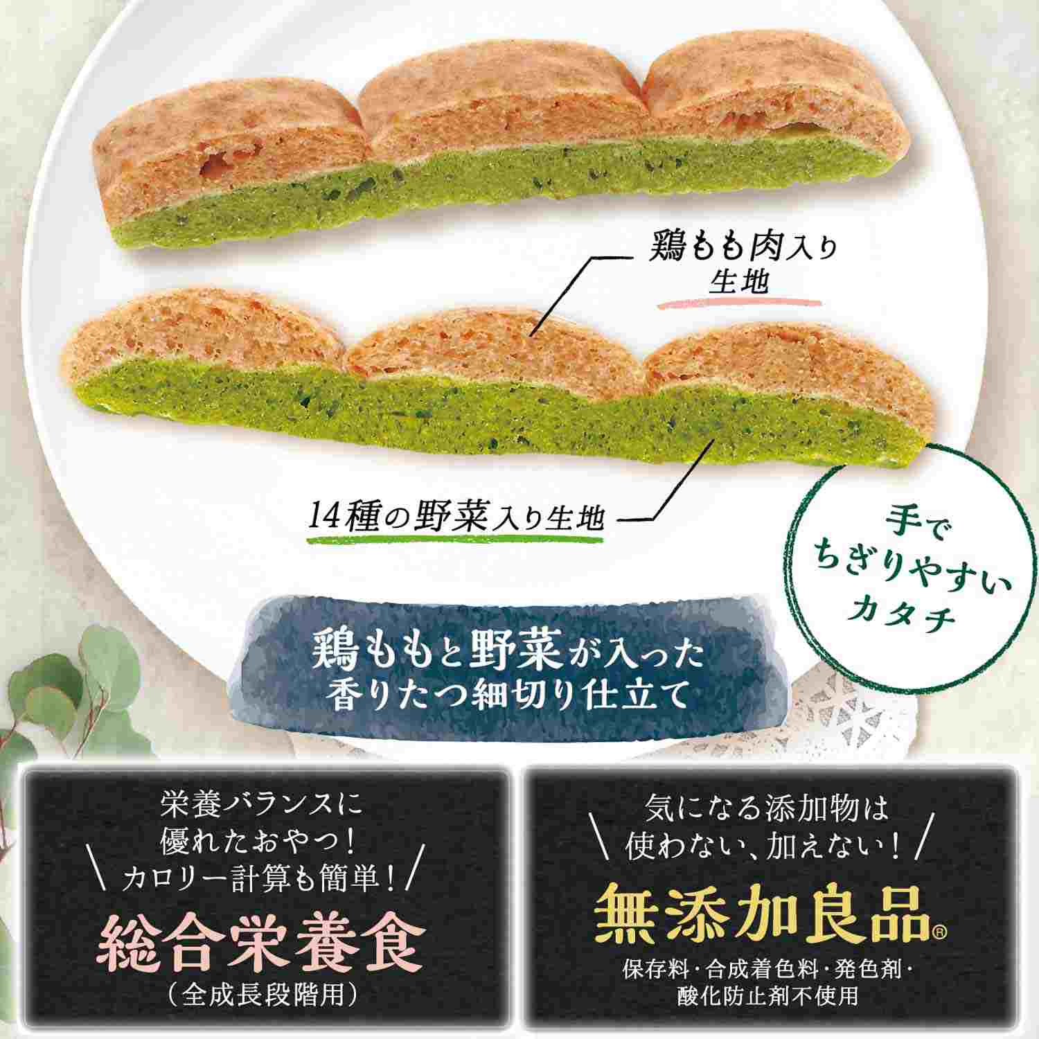 鶏もも肉と14種の野菜が入った2層の異なる味わい。香りたつ細切り仕立て。総合栄養食基準のおやつ。