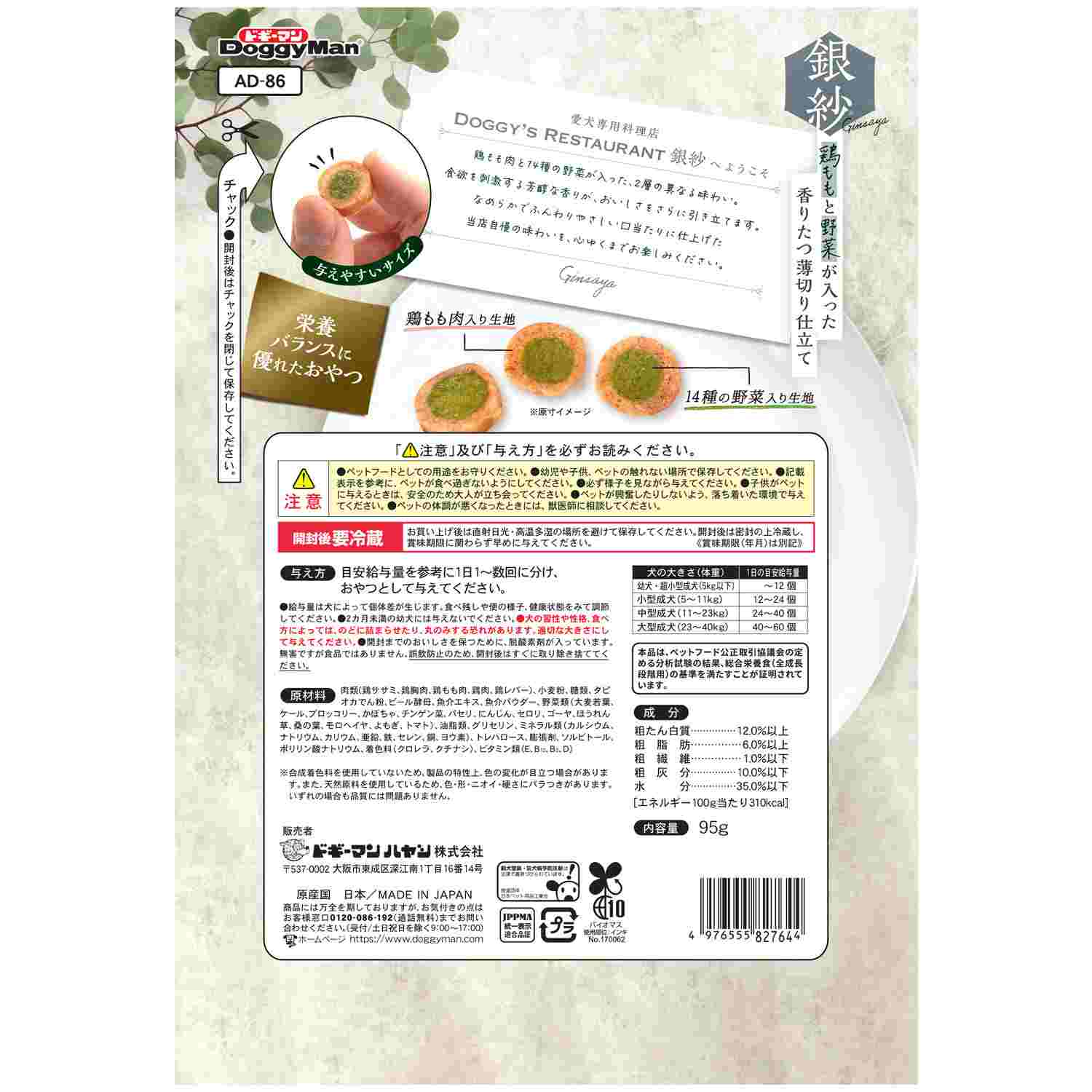 肉類(鶏ササミ、鶏胸肉、鶏もも肉、鶏肉、鶏レバー)、小麦粉、糖類、タピオカでん粉、ビール酵母、魚介エキス、魚介パウダー、野菜類(大麦若葉、ケール、ブロッコリー、かぼちゃ、チンゲン菜、パセリ、にんじん、セロリ、ゴーヤ、ほうれん草、桑の葉、モロヘイヤ、よもぎ、トマト)、油脂類、グリセリン、ミネラル類(カルシウム、ナトリウム、カリウム、亜鉛、鉄、セレン、銅、ヨウ素)、トレハロース、膨張剤、ソルビトール、ポリリン酸ナトリウム、着色料(クロレラ、クチナシ)、ビタミン類(E、B12、B2、D)