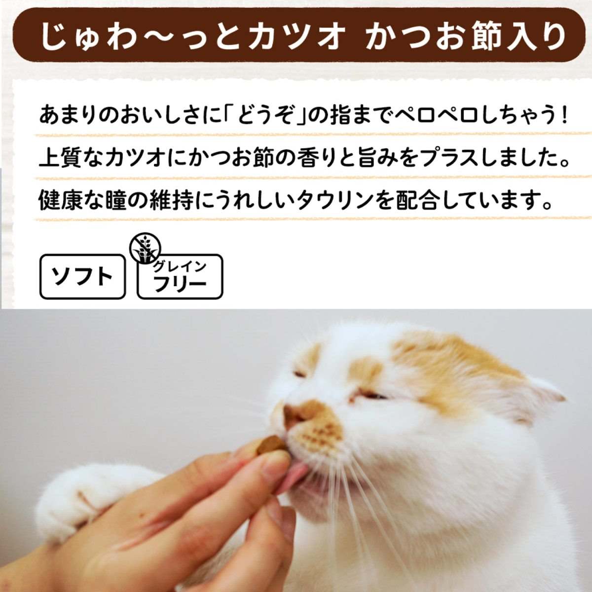 魚介類(かつお、かつお節、魚介エキス)、肉類(鶏ササミ、牛コラーゲン)、えんどう豆たん白、糖類、たん白加水分解物、酵母エキス、デキストリン、増粘安定剤(加工でん粉)、ソルビトール、ミネラル類(ナトリウム)、ポリリン酸ナトリウム、pH調整剤、くん液、タウリン