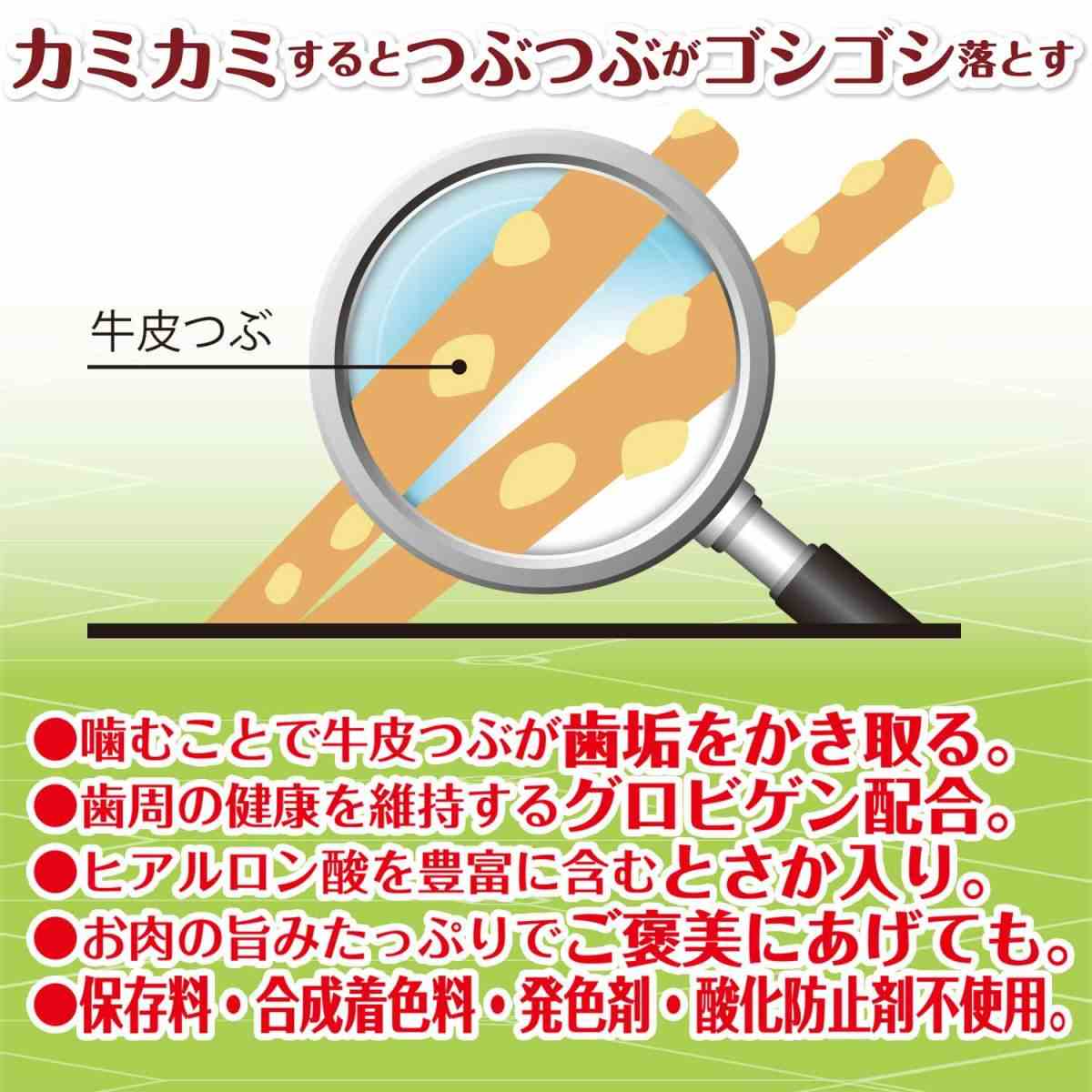 噛むことで牛皮つぶが歯垢をかき取る。歯周の健康を維持するグロビゲン配合。とさか入り。