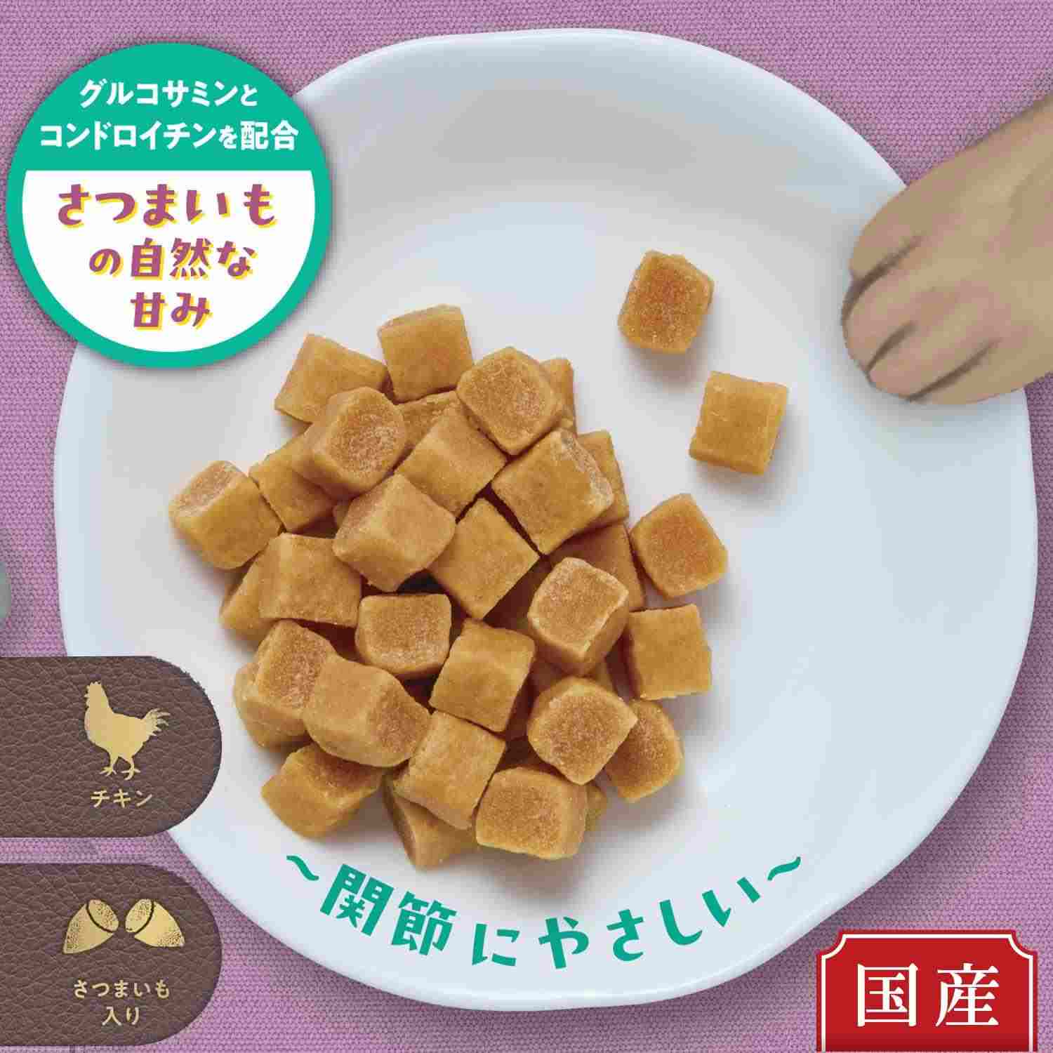 ●おいしさにカラダへの思いやりをプラスして作ったおやつじかんシリーズ。●もっちりとした食感、ひとくちサイズのちいさなキューブ。●愛犬が大好きなチキンと自然な甘みのさつまいも入り。●関節にやさしいグルコサミン・コンドロイチンを配合。●おやつじかんが待ち遠しくなるおいしさでしつけやごほうびにもなる。