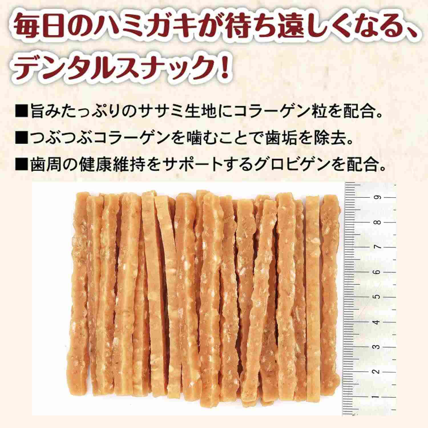 ササミ生地にコラーゲン粒を配合したデンタルスナック。粒を噛むことで歯垢を除去します。
