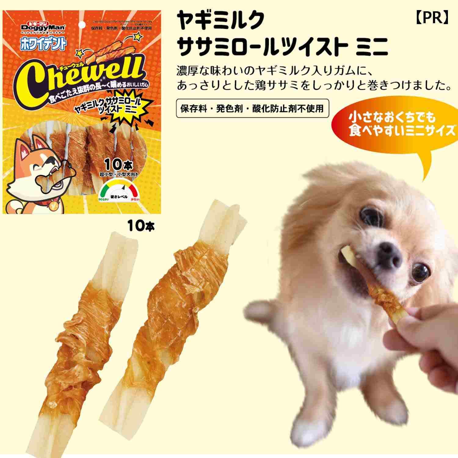 ●ヤギミルク入りガムに鶏ササミを巻き付けたガムスナック ●小さな口でも食べやすいミニサイズ。●濃厚な味わいのヤギミルク入りガムはフィン付きねじりタイプでがしっかり引っかかる。●ササミ肉を巻き付け食いつきもよい。●保存料・発色剤・酸化防止剤不使用。