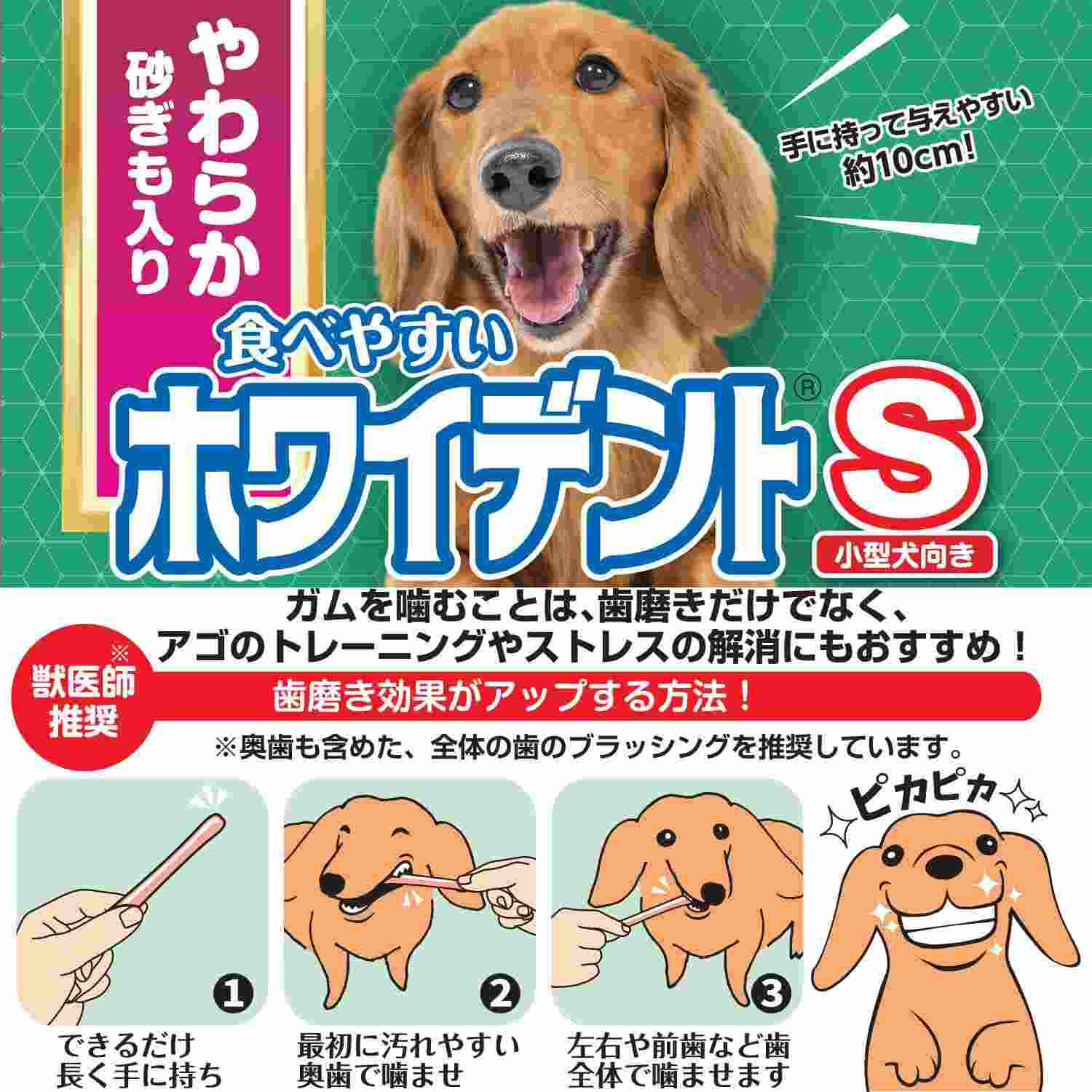 ●コラーゲンを含む牛皮を主原料にすなぎも配合で嗜好性をアップ。おいしくしっかり噛むことで歯垢を絡めとるセミソフトタイプのガムスナック。●中心部分が空洞になっているため歯が刺ささったときに歯の汚れをこそげ落としやすい。●噛むことで牛皮のコラーゲンの繊維が歯に食い込み、歯垢を絡め取り、口腔内の健康維持に役立つ。●砂ぎも入りで食べやすく、歯周の健康維持に卵黄粉末(グロビゲン)も配合。手に持って与えやすい1本約10cm。●ホワイデントを食後に一本、ホワイデントで歯磨き習慣を始めましょう。