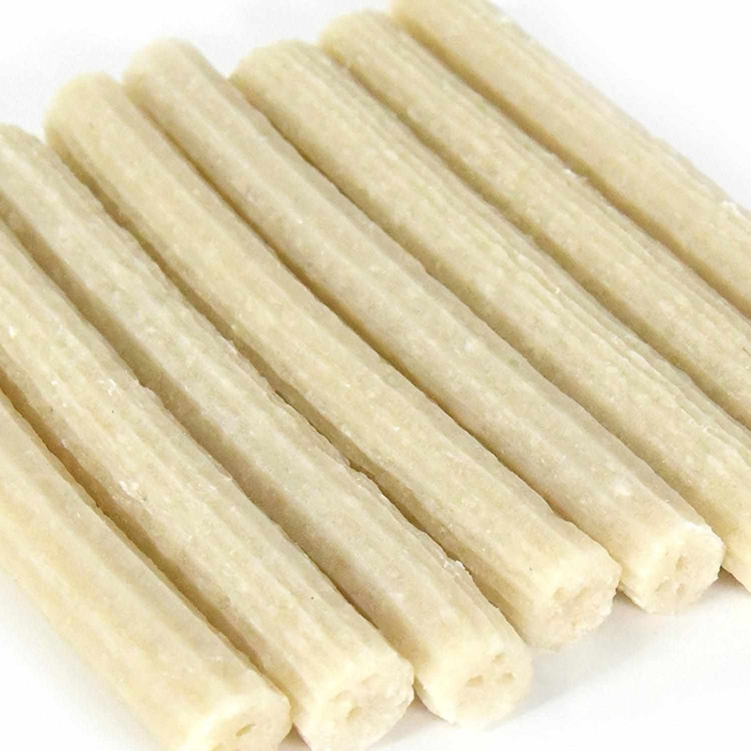 ●コラーゲンを含む牛皮を主原料にすこしソフトに仕上げたガムスナック。ほんのり甘いミルクの香りと味が食欲をそそる。