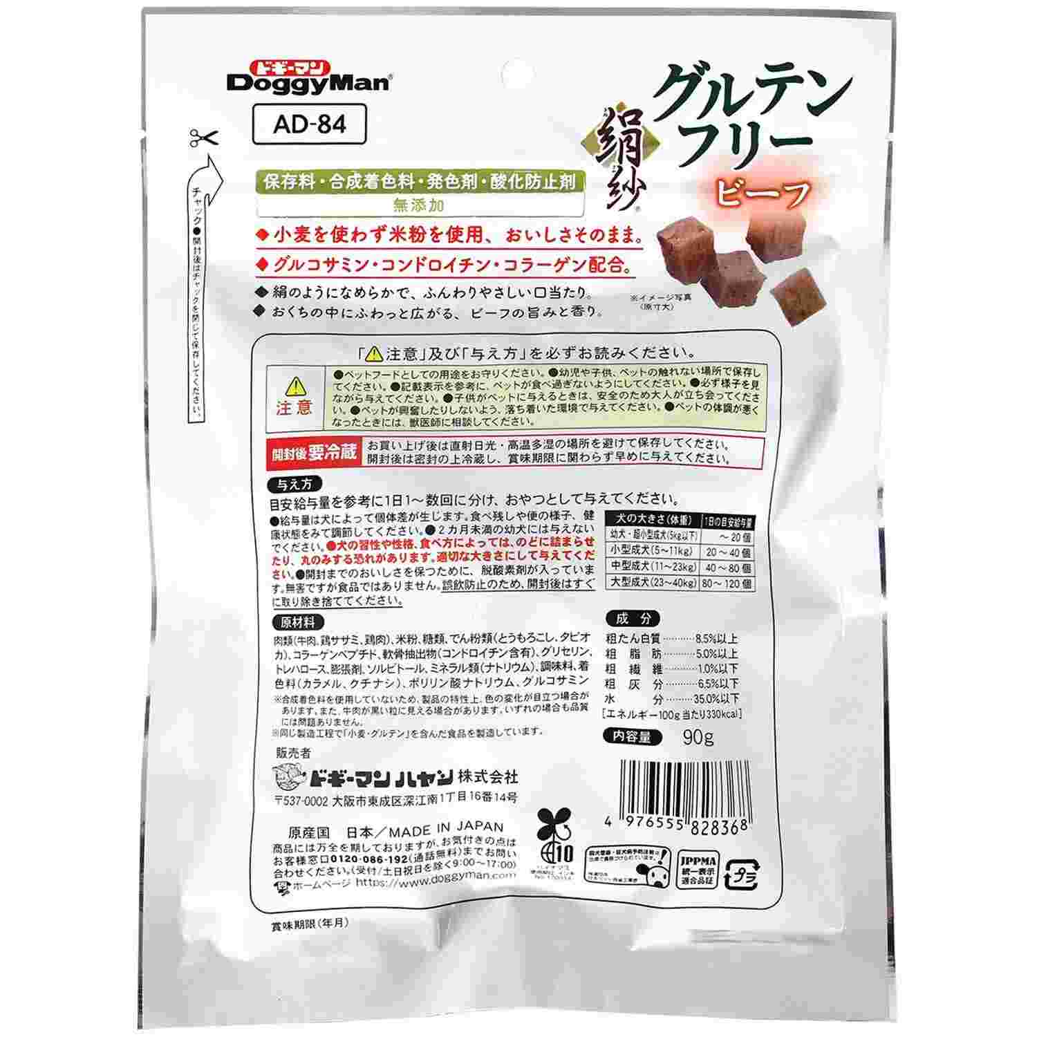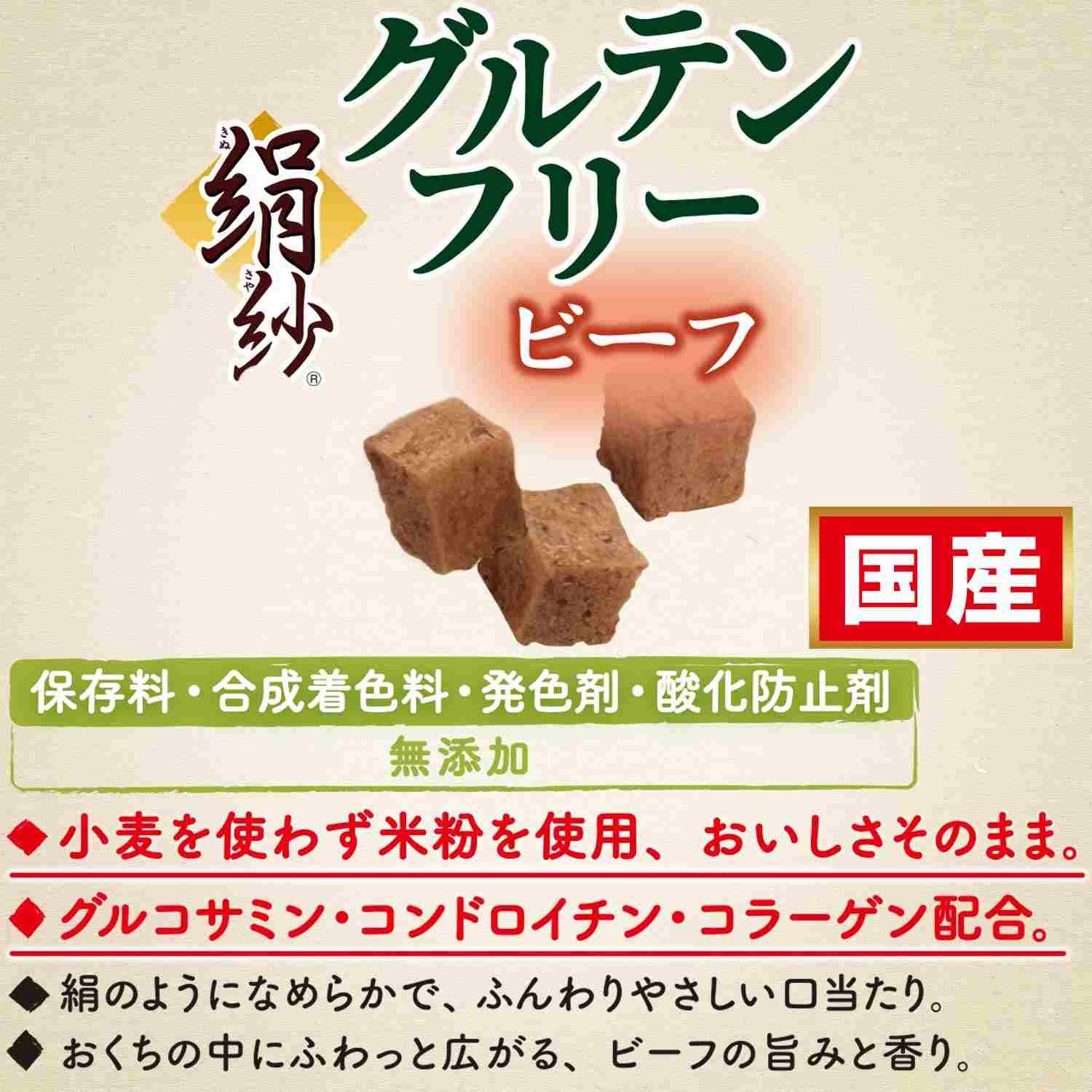 ●最高のごほうび、おくちに残る至福の味わい。絹紗のグルテンフリータイプ。 ●小麦を使わず米粉を使用。おいしさは絹紗そのまま。●ビーフの旨み豊かで濃厚な味わい。超小型・小型犬や、シニア犬にうれしい極上のやわらかさ。●健康維持にうれしい、グルコサミン・コンドロイチン・コラーゲン配合。●保存料・合成着色料・発色剤・酸化防止剤無添加の無添加良品品質。