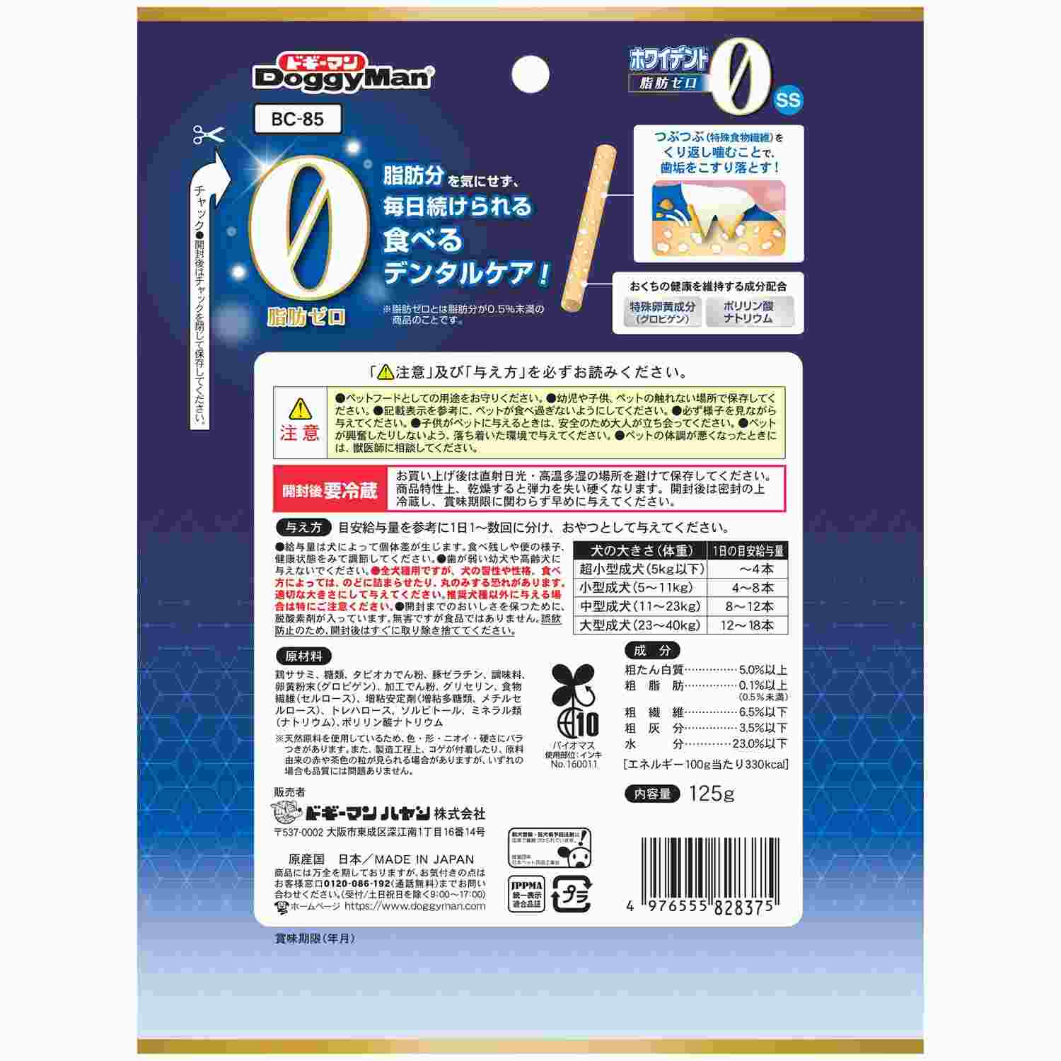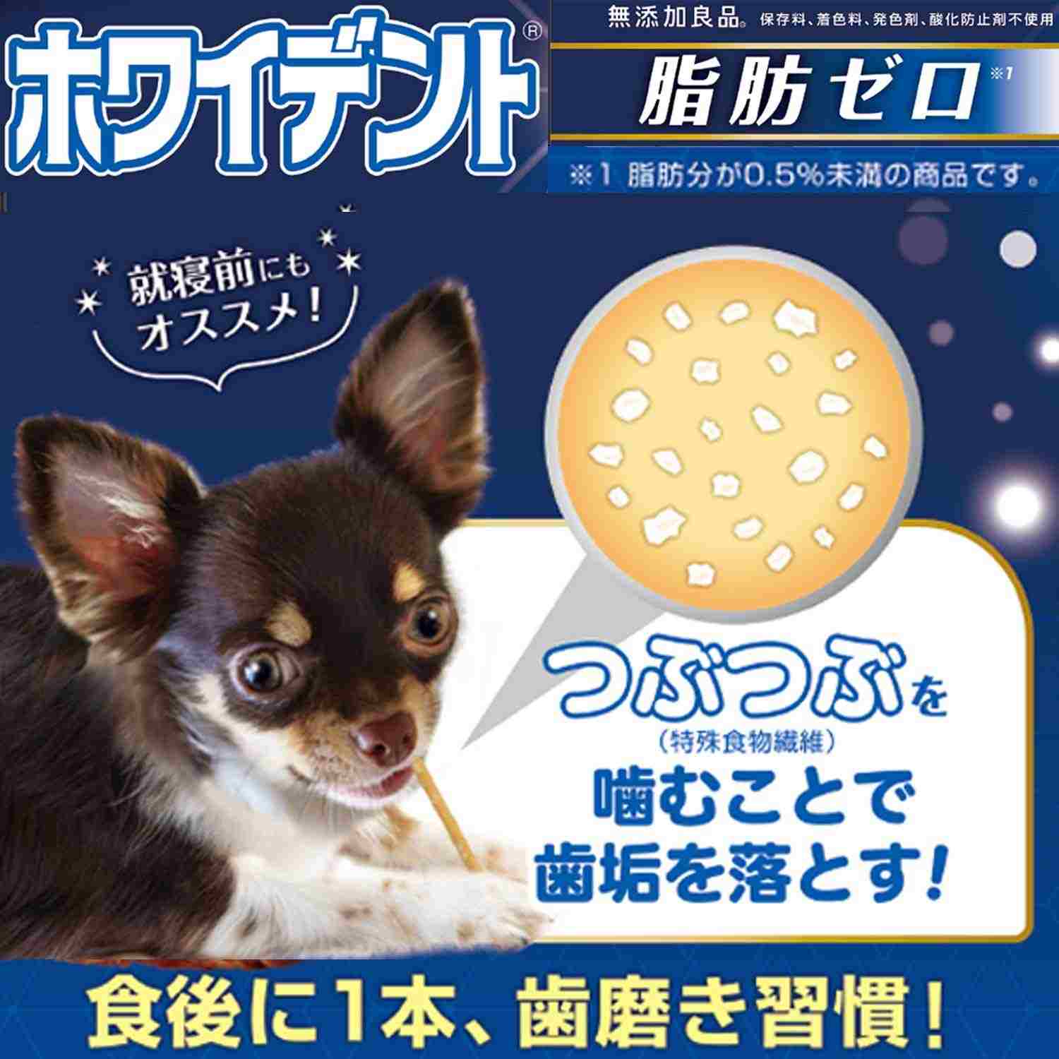 ●毎食後に噛んで欲しいから脂肪ゼロ。脂肪分を0.5%未満に調整した脂肪ゼロタイプの歯みがきガムスナック。 ●しなやかで適度なやわらかさで粘り強い。しっかり噛んで食べやすいスティック形状のガム。超小型犬向き。●練り込んだ特殊食物繊維のつぶつぶを繰り返し噛むことで歯垢を落とす。●歯周の健康を維持する特殊卵黄成分(グロビゲン)、ポリリン酸ナトリウム配合。●毎食後の習慣に安心の保存料、着色料、発色剤、酸化防止剤不使用、無添加良品品質。