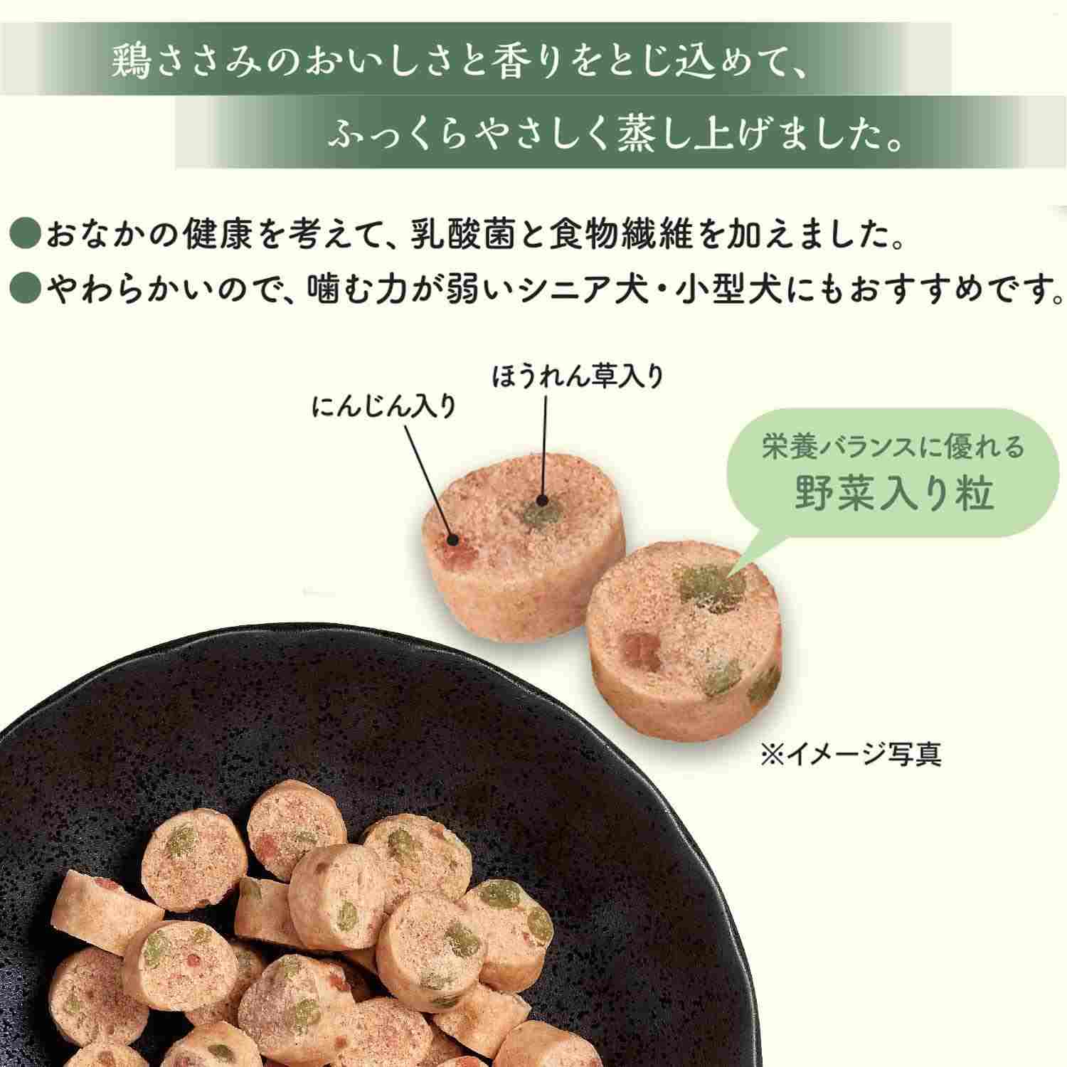 鶏ささみ生地をやわらかく蒸し上げました。乳酸菌・食物繊維配合。