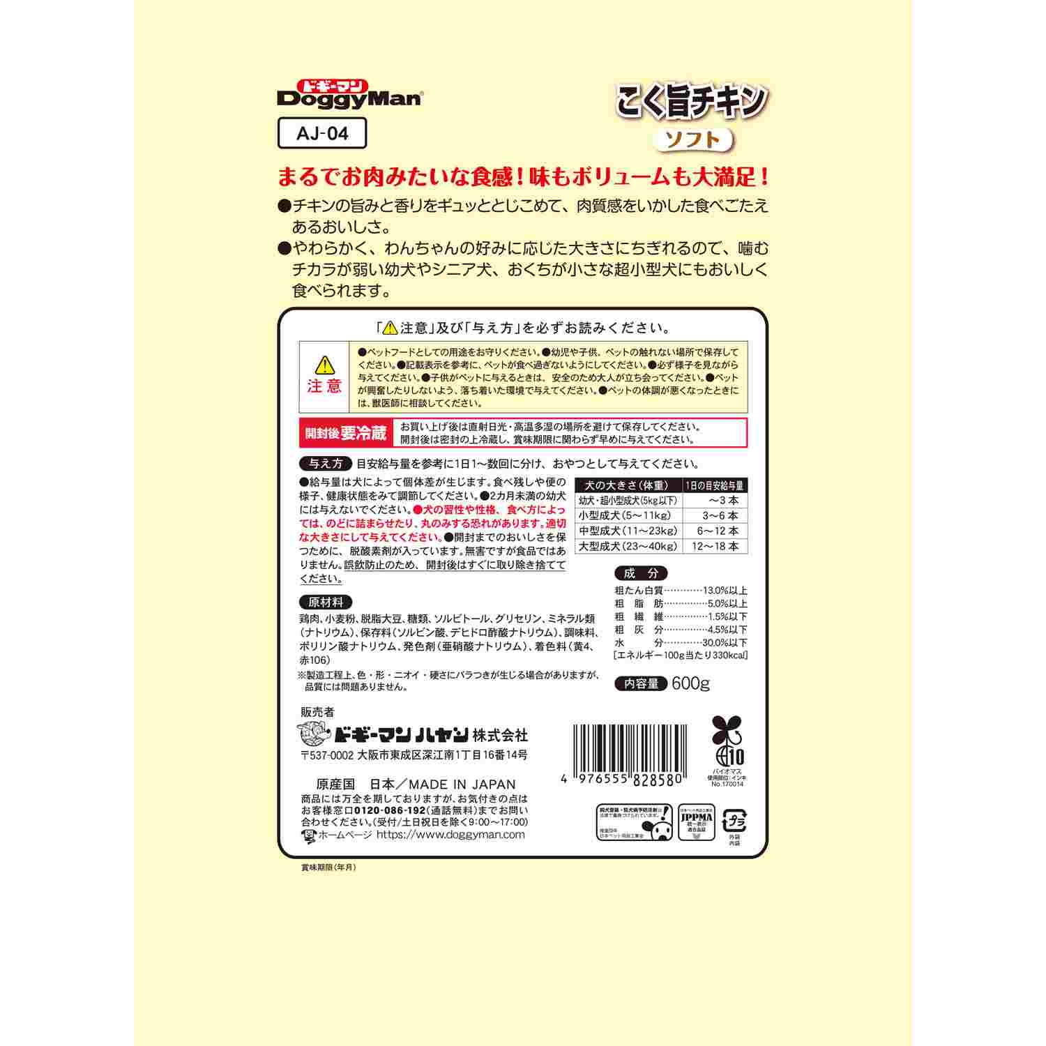 ●お肉が大好きな愛犬にボリューム満点もっちりやわらかチキンジャーキー。●お肉の旨味と香りを存分に堪能できる。●ソフトでちぎりやすく、食べやすい大きさにできる。●やわらかく、ちぎれるので噛む力が弱い幼犬やシニア犬、口が小さな超小型犬も美味しく食べられる。●ごほうびに、お散歩帰りなどにぴったり。