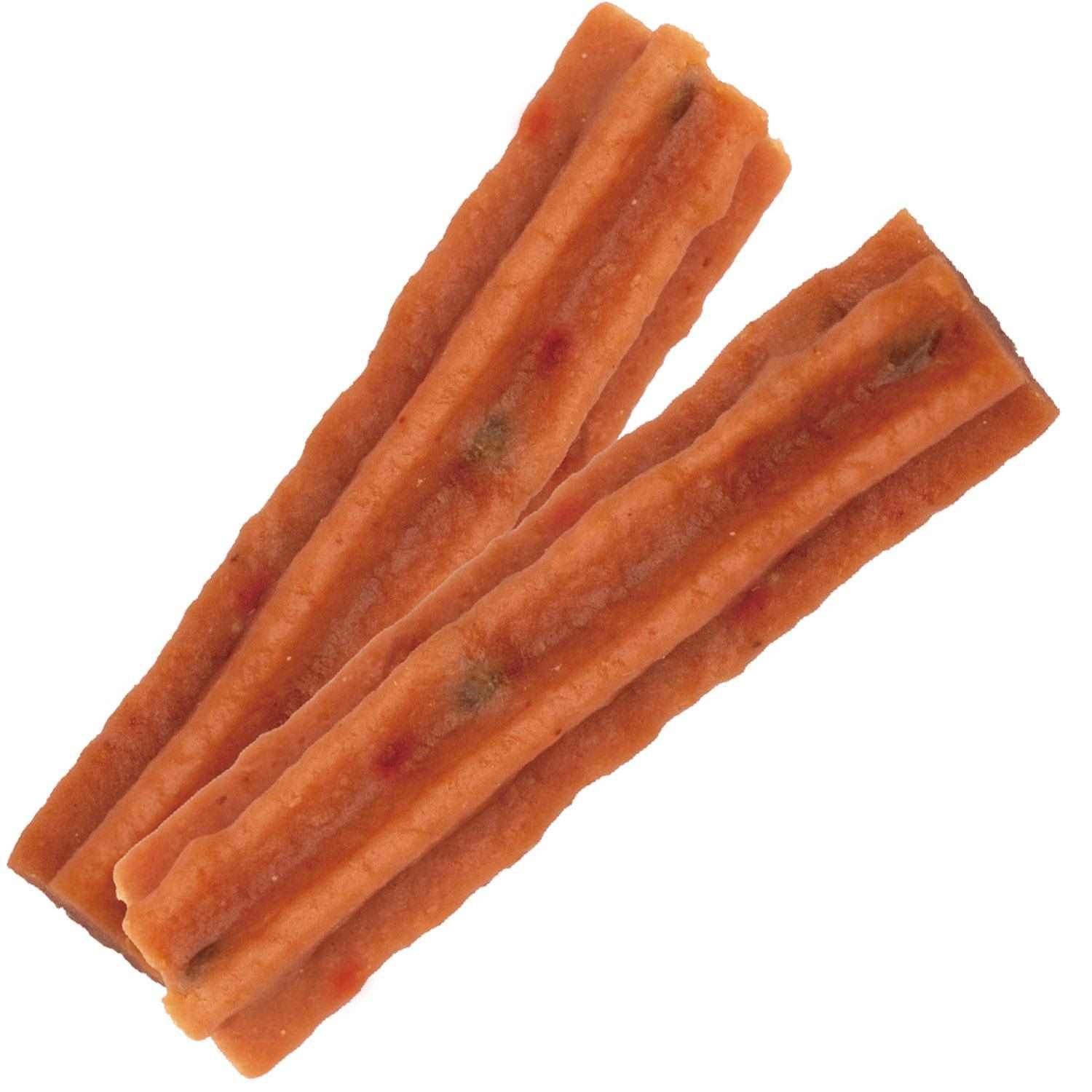 ●お肉が大好きな愛犬にボリューム満点もっちりやわらかチキンジャーキー。緑黄色野菜(にんじん、ほうれん草)配合。