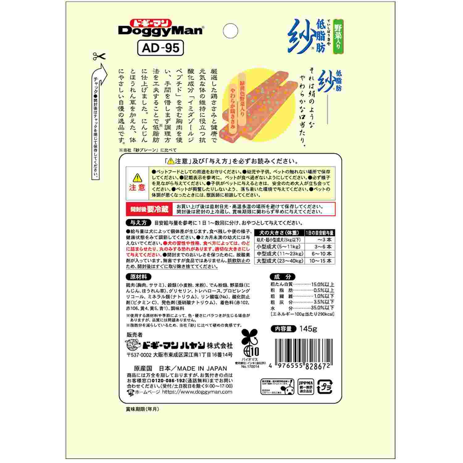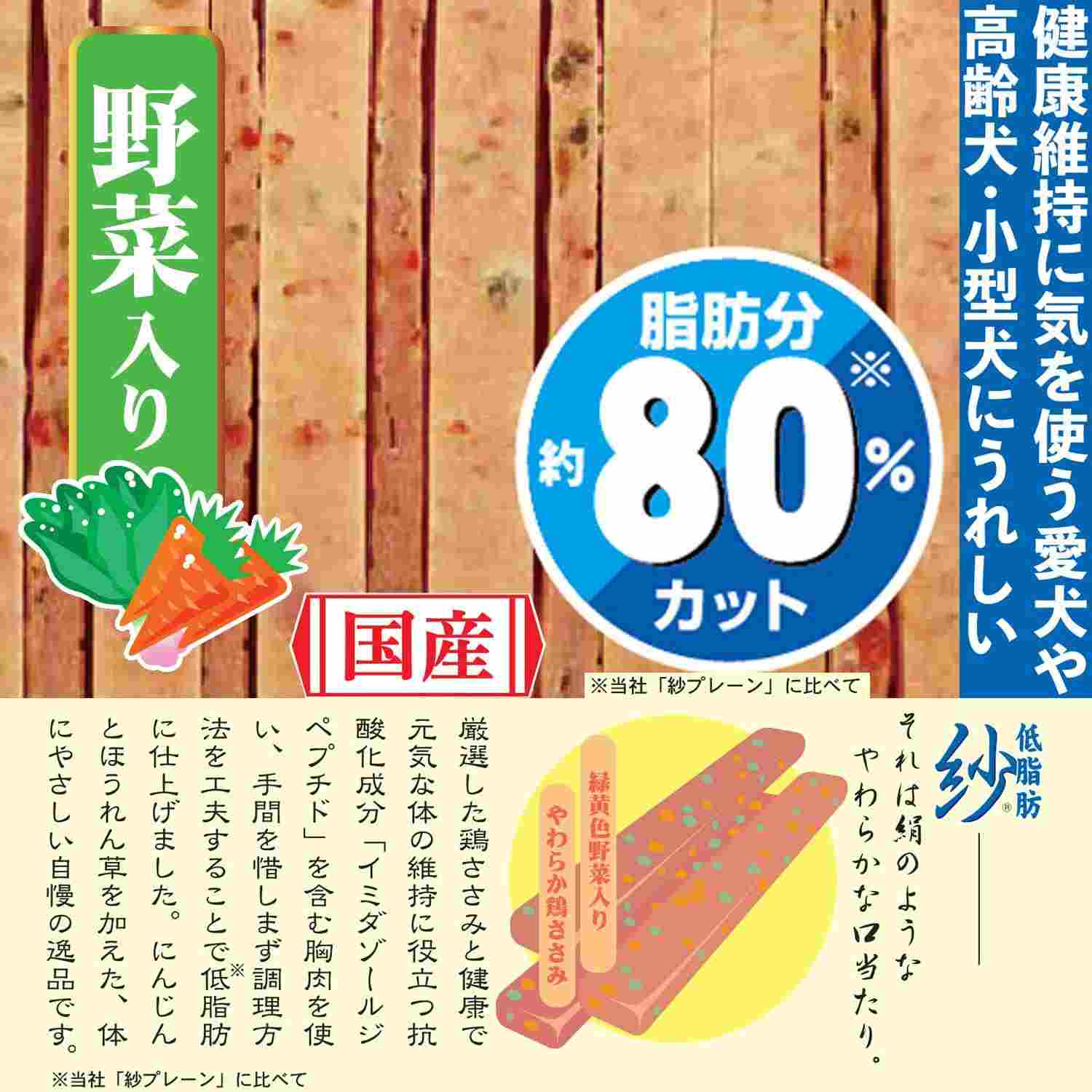 ●調理方法を工夫することでドギーマンの「紗プレーン」に比べ、おいしさはそのままに脂肪分を約80%カットした低脂肪紗。●鶏胸肉と鶏ささみを練り込んで絹のようなやわらかな口当たりに仕上げたごほうび。●鶏胸肉は健康で元気な体の維持に役立つ抗酸化成分「イミダゾールジペプチド」を含む。●消化吸収しやすいよう加熱したにんじんとほうれん草入り。●やわらかな細切りでちぎってもあたえやく、健康維持に気を使う愛犬や高齢犬、小型犬にうれしいごほうび。