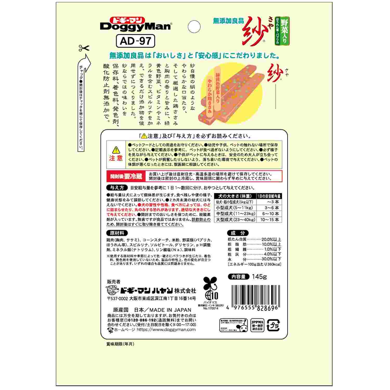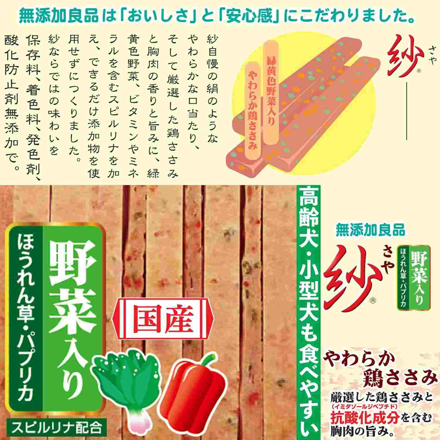 ●保存料、着色料、発色剤、酸化防止剤を使用しない無添加良品の野菜入り紗。●鶏胸肉と鶏ささみを練り込んで絹のようなやわらかな口当たりに仕上げたごほうび。●鶏胸肉は健康で元気な体の維持に役立つ抗酸化成分「イミダゾールジペプチド」を含む。●緑黄色野菜のほうれん草、パプリカ、そしてビタミンやミネラルを含むスピルリナを配合。●やわらかな細切りでちぎってもあたえやく、高齢犬、小型犬も食べやすいうれしいごほうび。