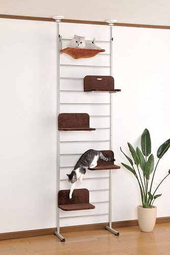 ジョイントしてネジを止めるだけの簡単組み立て! 奥行きが少なく、スペースをとりません 棚板やハンモックは上下左右お好みの位置に取り付け可能 複数を並べて使えば、ネコちゃんも大喜び!