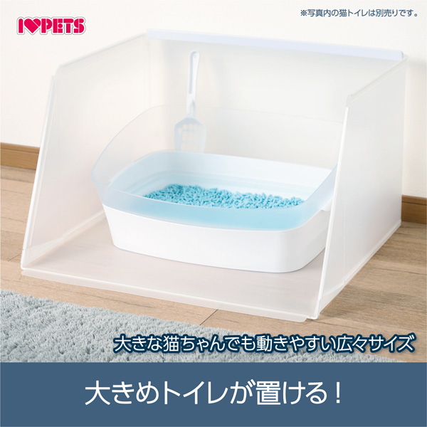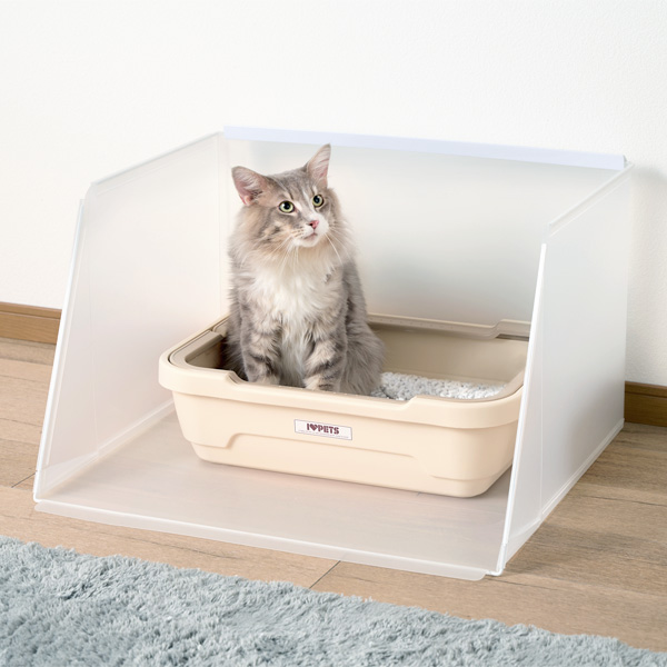 壁面から床面への猫砂や汚れの飛散を防ぐ猫トイレ用スクリーン。高い壁で猫砂の飛散をしっかりガード。目隠し効果もあるのでトイレ時の視線を気にする猫ちゃんにも。床面はトイレより少し長めの設計で、トイレから出る時の猫砂の散らかりを防止します。凹凸が少ないフラット形状。トイレの出し入れがしやすく、水洗いもできるのでお手入れ簡単。軽量なので持ち運びやすく、中に溜まった猫砂を一気に捨てられます。※この商品はトイレ時の猫砂や汚れの飛散を軽減しますが、完全に防ぐものではありません。