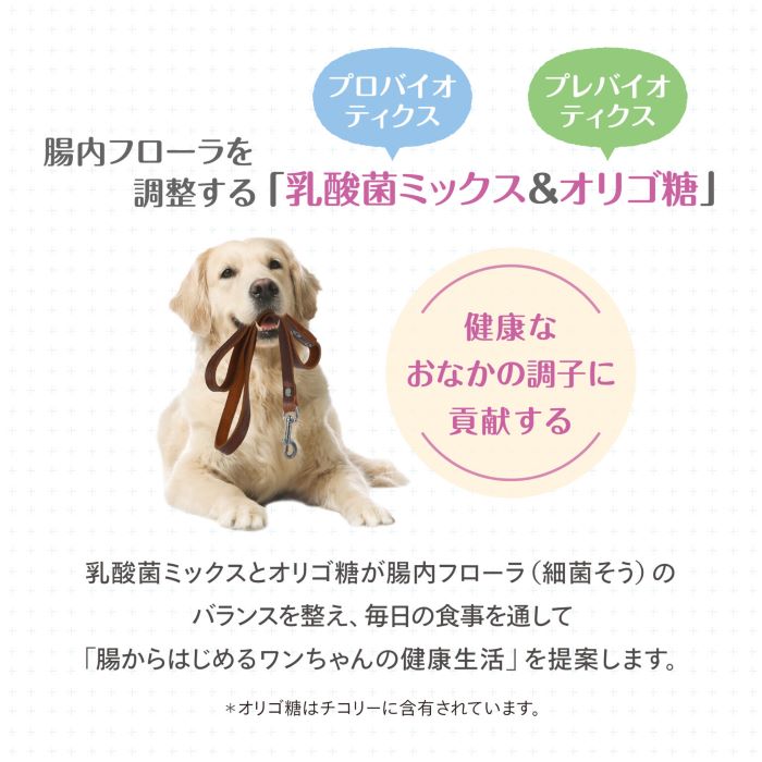 4.乳酸菌ミックスとオリゴ糖が腸内フローラ(細菌そう)のバランスを整え、毎日の食事を通して「腸からはじめるワンちゃんの健康生活」を提案します。