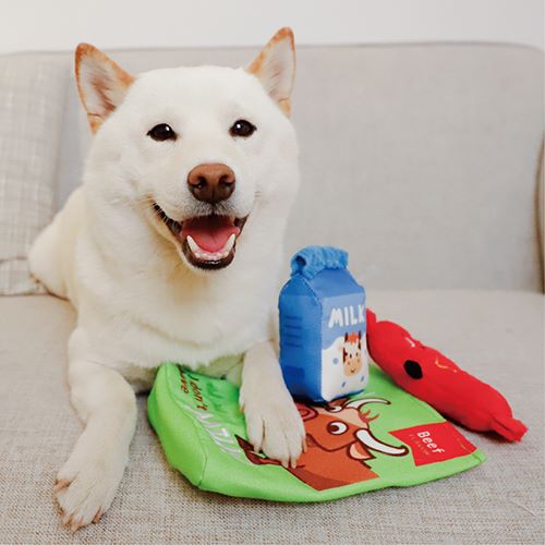 スクィーカーとカシャカシャ音が鳴るクリンクル素材、それぞれが入った2つのミニトーイを袋の中に隠して遊べるドッグトーイです。