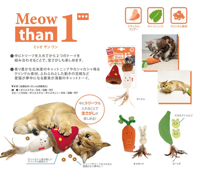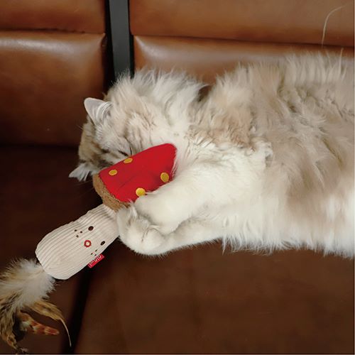 香り豊かな北米産のキャットニップやカシャカシャ鳴るクリンクル素材、ふわふわとした動きの羽根など愛猫が夢中になる要素が満載のキャットトーイ。