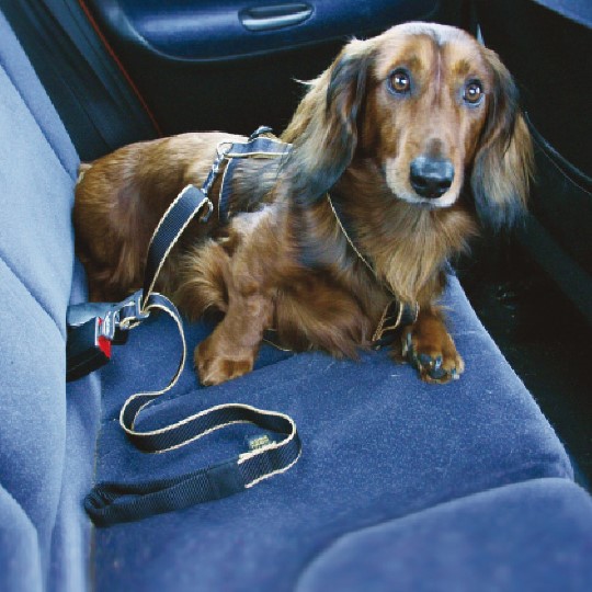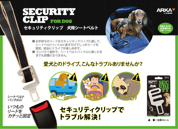 お手持ちのリードをセキュリティクリップに通して、シートベルトバックルに差すだけでしっかりリードを固定。