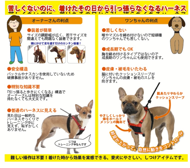 装着するだけで、愛犬の首や呼吸に負担をかけずに引っ張る力をコントロールできる、引っ張り防止胴輪です。