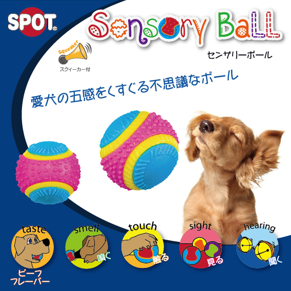 愛犬の五感(視覚、聴覚、嗅覚、味覚、触覚)をそれぞれ使って遊べるカラフルで楽しいボールです。五感が発達中のパピーや、聴覚・視覚が低下してきたシニアにもおすすめです。中に入っている鈴の音と鳴り笛で2つの音が鳴り、様々な突起の感触も楽しめます。ビーフフレーバー付きです。