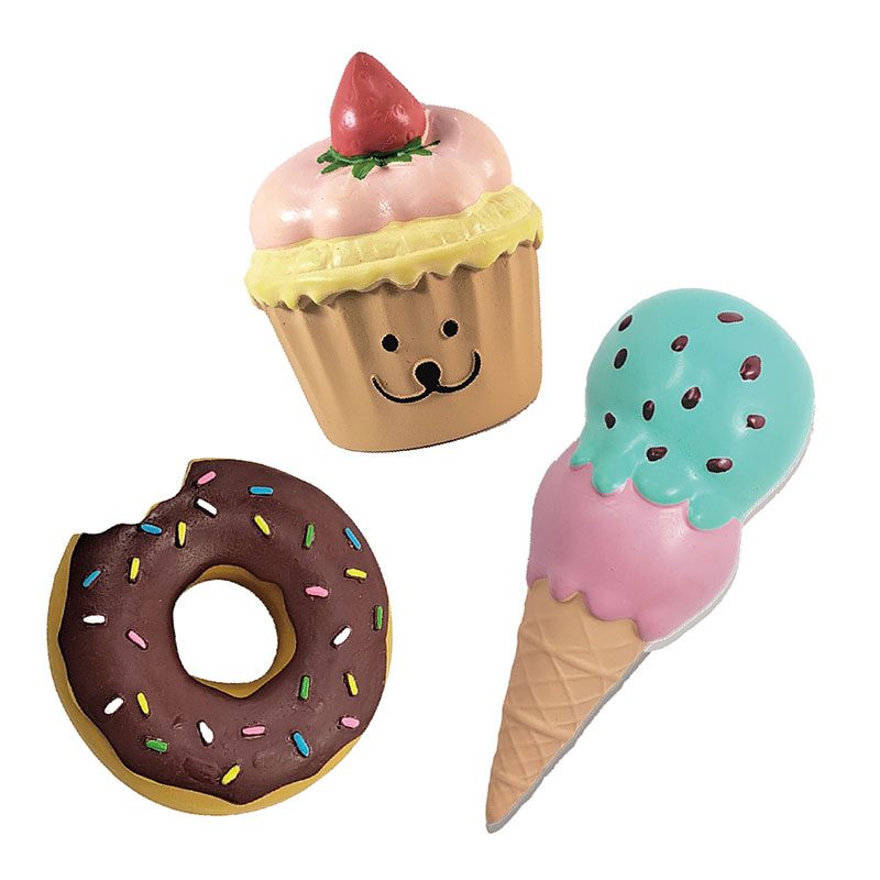 ファストフードの代表格、テイクアウト!にスイーツシリーズが仲間入り。ケーキ・ドーナツ・アイスクリームをかわいい愛犬サイズに仕上げました。スクィーカーを鳴らしやすいやわらかラテックストーイです。