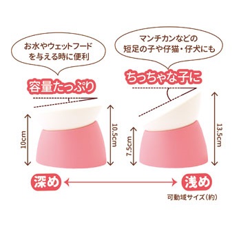 「ペットの種類を選ばず、食べやすく」というコンセプトの傾き自在の食器!割れにくく洗いやすいプラ食器です。足付きなので器だけでも使用できます。安定した平らな場所に置いて使用してください。