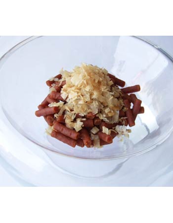 血合い抜き鰹の淡白な味です。ふわふわで小さめの削りが独特の風味とライトな旨みを際立てます。ふりかけとしても便利です。