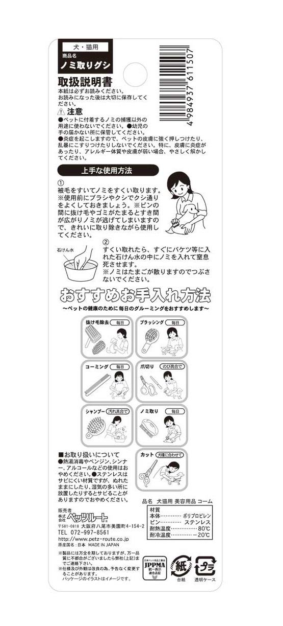 ●ペットに付着するノミの捕獲以外の用途に使わないでください。●幼児の手の届かない所に保管してください。●炎症を起こしますので、ペットの皮膚に強く押し付けたり、乱暴にこすりつけたりしないでください。 特に皮膚に炎症があったりアレルギー体質や皮膚が弱い場合、やさしくとかしてください。