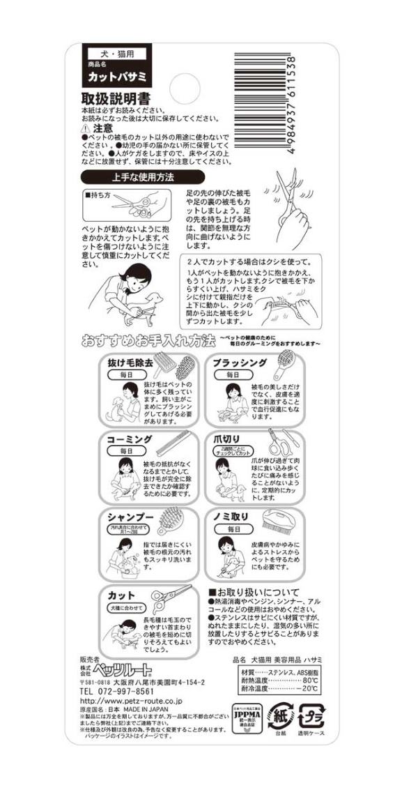 ●ペットの被毛のカット以外の用途に使わないでください。●幼児の手の届かない所に保管してください。●炎症を起こしますので、ペットの皮膚に強く押し付けたり、乱暴にこすりつけたりしないでください。 特に皮膚に炎症があったりアレルギー体質や皮膚が弱い場合、やさしくとかしてください。