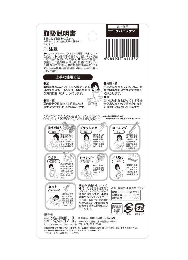 ●ペットのグルーミング以外の用途に使わないでください。●幼児の手の届かない所に保管してください。●炎症を起こしますので、ペットの皮膚に強く押し付けたり、乱暴にこすりつけたりしないでください。 特に皮膚に炎症があったりアレルギー体質や皮膚が弱い場合、やさしくとかしてください。