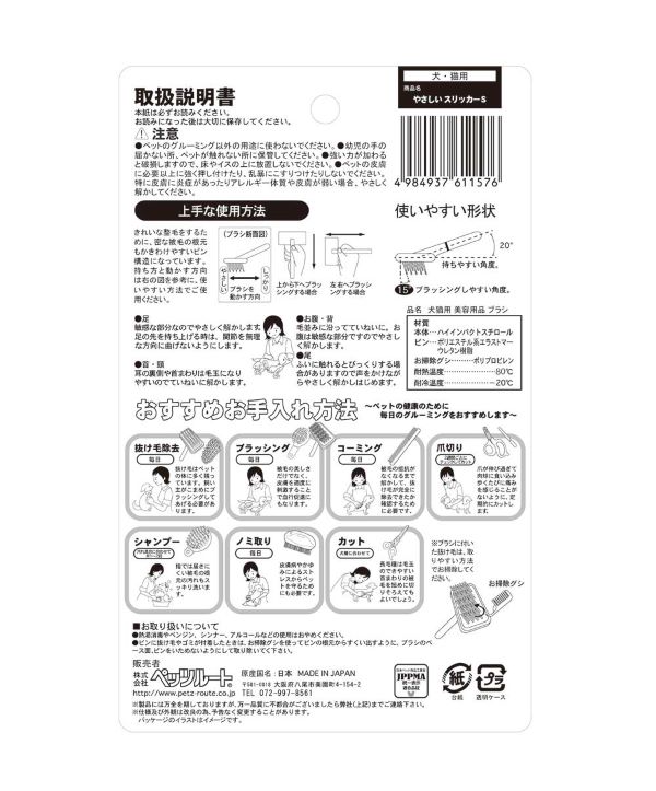 ●ペットのグルーミング以外の用途に使わないでください。●幼児の手の届かない所、ペットが触れない所に保管してください。●強い力が加わると破損しますので、床やイスの上放置しないでください。●ペットの皮膚に必要以上に強く押し付けたり、乱暴にこすりつけたりしないでください。 特に皮膚に炎症があったりアレルギー体質や皮膚が弱い場合、やさしくとかしてください。