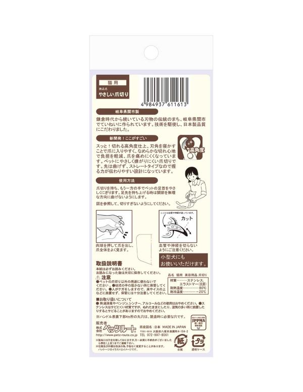 スッ!と切れる高角度刃仕上、刃角を寝かすことで爪に入りやすく、なめらかな切れ心地で負担を軽減、爪を痛めにくくなっています。ペットにやさしく、嫌がりにくい爪切りです。先は曲げず、ストレートタイプなので、握る力が伝わりやすい設計になっています。小型犬にもお使いいただけます。刃物の伝統の町岐阜県関市製。