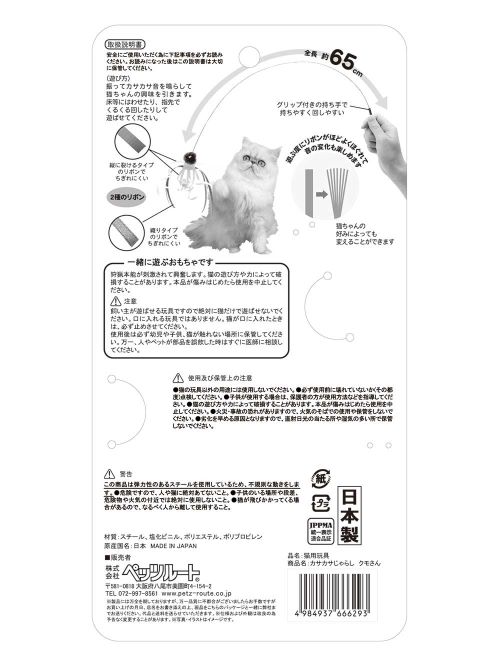 2種のリボンのハーモニーで、まるでクモさんが動いているみたいなカサカサ音がします。ちょうどいい長さの弾力があるスチールを使用しているのでリアルな動きが出せます。グリップ付きの細めの持ち手なので、はわせたり、指先で回しやすい!遊ぶ度にリボンがほどよくほぐれて、音の変化も楽しめます【使用方法】振ってカサカサ音を鳴らして猫ちゃんの興味を引きます。床等にはわせたり、指先でくるくる回したりして遊ばせてください。<注意>猫ちゃんと一緒に遊ぶおもちゃです。狩猟本能が刺激されて興奮します。猫の遊び方や力によって破損することがあります。本品が傷みはじめたら使用を中止してください。