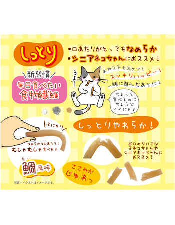 【商品説明】鯛風味で、口あたりがとってもなめらかなしっとりタイプです。シニアの猫におすすめしたい食物繊維入りの毛玉ケアスナックです。