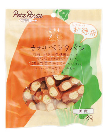 鶏肉(ささみ、胸肉)、小麦粉、でん粉類、魚軟骨、にんじん、ほうれん草、ソルビトール、グリセリン、プロピレングリコール、膨張剤、食塩、リン酸塩(Na)、酸化防止剤(ビタミンE)、発色剤(亜硝酸Na)、炭酸カルシウム、着色料(赤102、赤106、黄4、黄5、青1)