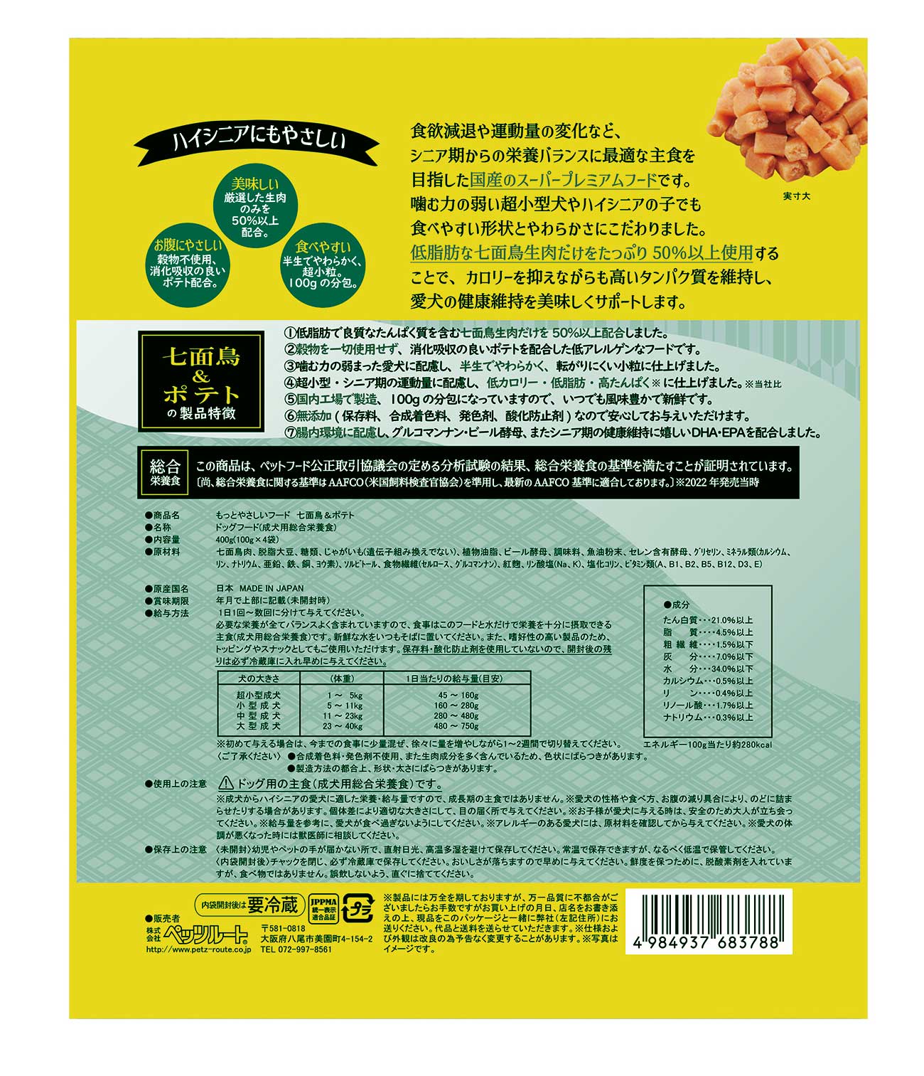 商品説明(1)新鮮さと美味しさにこだわり、脂質の多い皮部分を取り除いた七面鳥の生肉を50%以上配合しました。(2)アレルギーに配慮し、穀物を一切使わず、消化吸収の良いポテトを配合しました。(3)噛む力の弱まった愛犬に配慮し、半生でやわらかく、転がりにくい小粒に仕上げました。(4)超小型・シニア期の栄養活動量に配慮し、低カロリー・低脂肪・高タンパク※に仕上げました。※当社比(5)国内工場のみで製造、100gの分包になっていますのでいつでも風味豊かで新鮮です。(6)無添加(保存料、合成着色料、発色剤、酸化防止剤)なので安心して与えて頂けます。(7)腸内環境に配慮し、グルコマンナン・ビール酵母、またシニア期の健康維持に嬉しいEPA・DHAを配合しました。