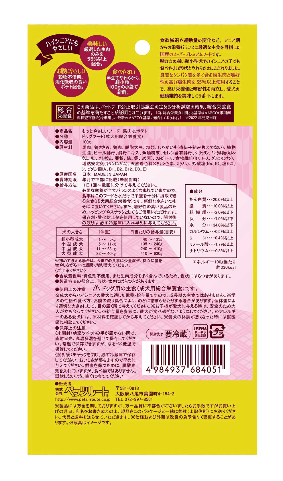 商品説明(1)新鮮さと美味しさにこだわり、栄養価の高い生の馬肉と嗜好性の高い鶏肉を55%以上配合しました。(2)アレルギーに配慮し、穀物を一切使わず、消化吸収の良いポテトを配合しました。(3)噛む力の弱まった愛犬に配慮し、半生でやわらかく、転がりにくい小粒に仕上げました。(4)超小型・シニア期の活動量に配慮し、鉄分とカルシウムをバランスよく配合しました。(5)国内工場のみで製造、100gの分包になっていますのでいつでも風味豊かで新鮮です。(6)無添加(保存料、合成着色料、発色剤、酸化防止剤)なので安心して与えて頂けます。(7)腸内環境に配慮し、グルコマンナン・ビール酵母、またシニア期の健康維持に嬉しいEPA・DHAを配合しました。