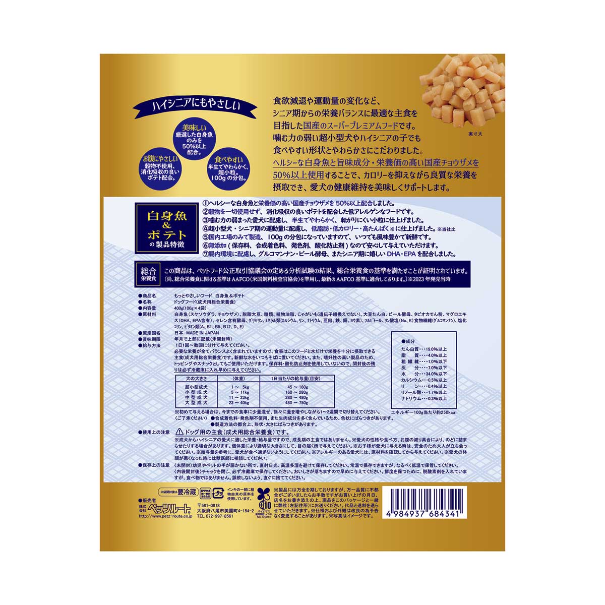 ヘルシーで旨味成分が豊富な白身魚をたっぷり配合した、シニア犬向けの国産スーパープレミアムフードです。