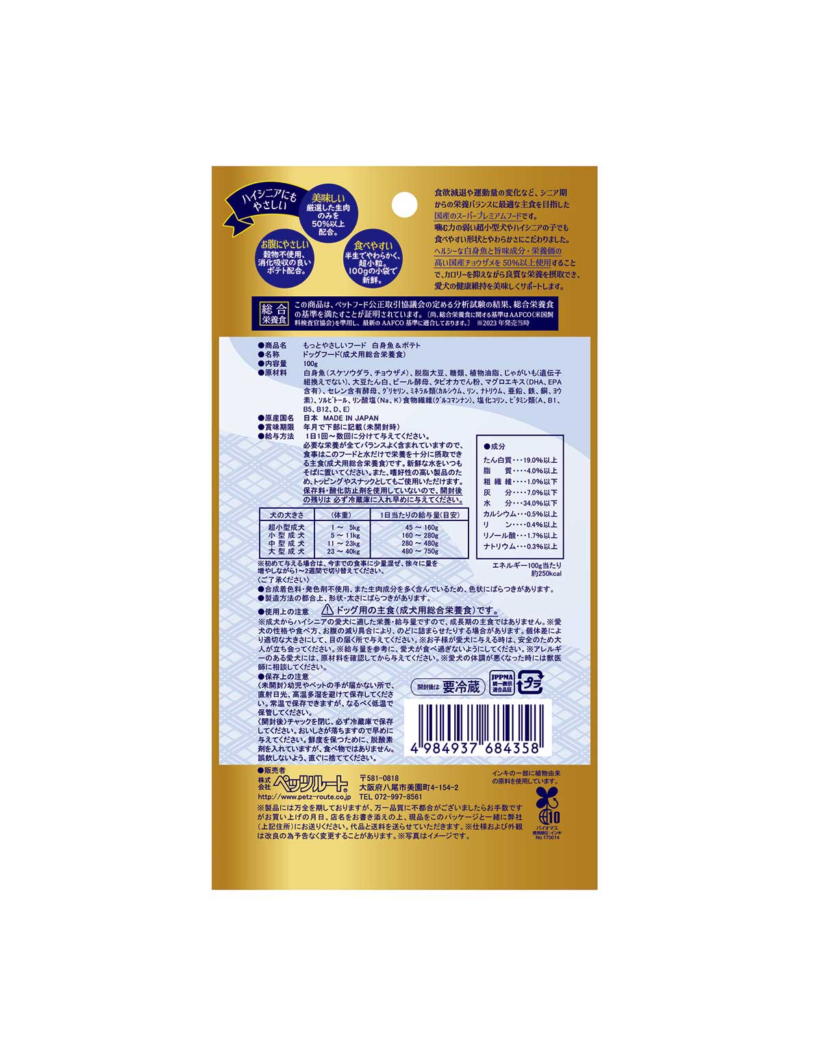 厳選した白身魚スケソウダラと国産のチョウザメを贅沢に使用。 ヘルシーで旨味成分が豊富な白身魚をたっぷり配合した、シニア犬向けの国産スーパープレミアムフードです。 成犬用総合栄養食。 ※合成着色料・発色剤不使用、また生肉成分を多く含んでいるため、色状にばらつきがあります。 ※製造方法の都合上、形状・太さにばらつきがあります。