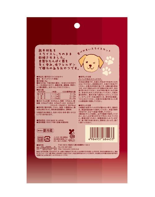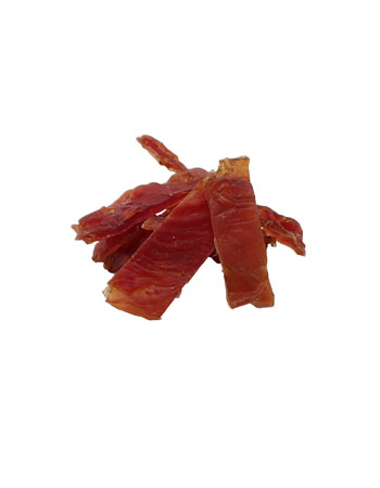 弾力のある筋肉・スジ等の手羽をまるごと乾燥し、与えやすくスライスしました。良質なたんぱく質を多く含み、低アレルゲンで弾力のあるおやつです。1日2回位に分けて、健康状態、運動量、季節により、量を調節して与えてください。
