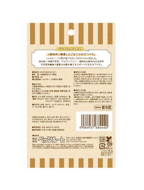 国産大豆100%の生おから使用。ハムスター、リスなどが食べやすい大きさに仕上げました。添加物・砂糖不使用、グルテンフリー、植物性の原料のみを使用。食物繊維(イヌリン)が豊富な菊いも配合。小動物の間食として数回に分けて残さない程度に与えてください。