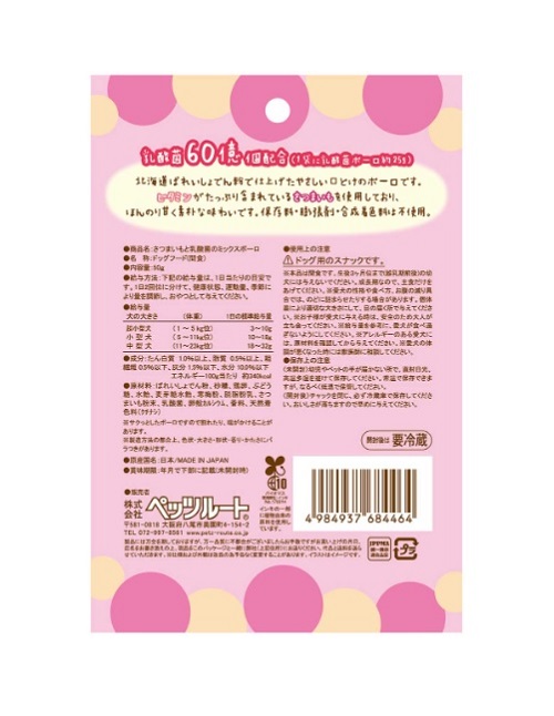 北海道ばれいしょでん粉で仕上げた、やさしい口どけのボーロです。ビタミンがたっぷり含まれているさつまいもを使用しており、ほんのり甘く素朴な味わいです。保存料・膨張剤・合成着色料は不使用。1日2回位に分けて、健康状態、運動量、季節により量を調節し、おやつとして与えてください。●サクッとしたボーロですので割れたり、端がかけることがあります。●製造の都合上、色状・大きさ・形状・香り・かたさにバラつきがあります。