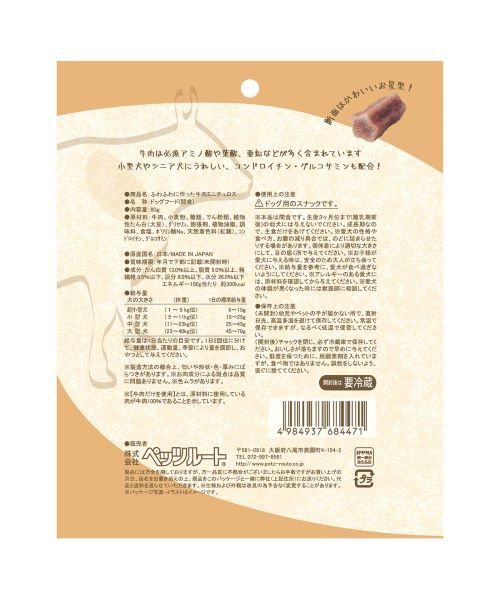 お肉原料は牛肉だけを使用!ふわふわ食感にした一口サイズのおやつです。保存料・合成着色料・発色剤・酸化防止剤無添加。1日2回位に分けて、健康状態、運動量、季節により、量を調節して与えてください。<注意>・製造方法の都合上、匂いや形状・色・厚みにばらつきがあります。・お肉成分による斑点は品質に問題ありません。・色ムラがあります。・「牛肉だけを使用」とは、原材料に使用している肉が牛肉100%であることを示しています。