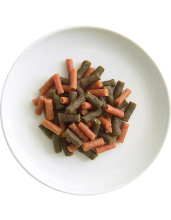 鶏肉、脱脂大豆、牛肉、小麦グルテン、ゼラチン、パン粉、野菜類(ほうれん草、大麦若葉、ケール、ブロッコリー、かぼちゃ、チンゲン菜、パセリ、にんじん、セロリ、苦瓜、桑の葉、モロヘイヤ、よもぎ、トマト)、米白絞油、麦芽糖、紅麹、調味料、食塩、クロレラ粉末、鮫軟骨抽出末(コンドロイチン硫酸含有)、グリセリン、ソルビトール、タピオカ加工でん粉、食物繊維、トレハロース、糖類、リン酸カルシウム、炭酸カルシウム、リン酸塩(Na、K)、塩化コリン、硫酸亜鉛、チアミンラウリル硫酸塩(ビタミンB1)、グルコサミン、ビタミンE、ピロリン酸第二鉄、ビタミンA、グルコン酸銅、ヨウ素、パントテン酸カルシウム、ビタミンD、ビタミンB2、ビタミンB12