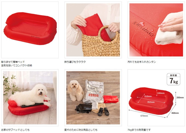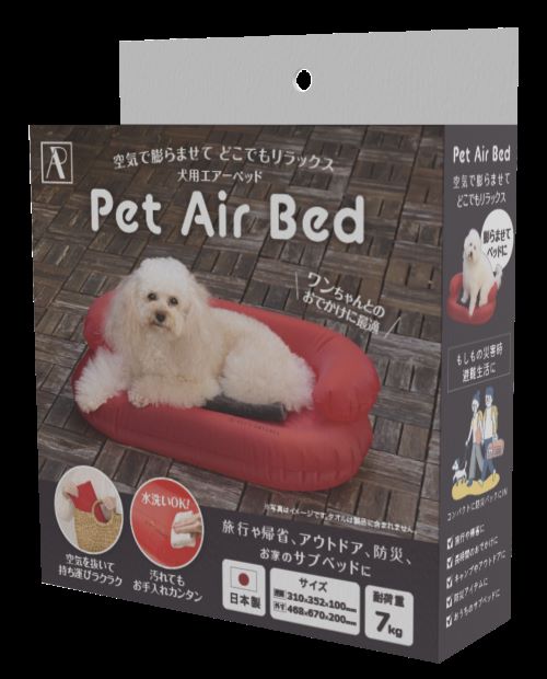 犬用エアーベッドは、荷物が多くなりがちな旅行やお出かけ先でも、空気で膨らませてベッドに早変わり。キャンプやアウトドア、車中泊でも使用でき、空気の入れ具合でお好みの固さに調節できるベッドです。空気を抜けば持ち運びもラクラク!お家のサブベッドとしてもご使用いただけます。防災アイテムとしてもピッタリ。