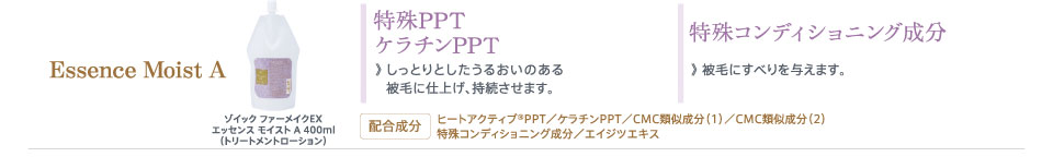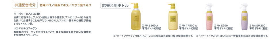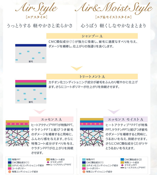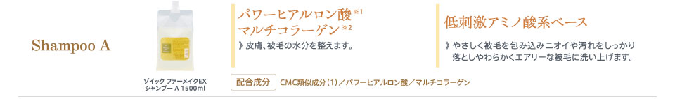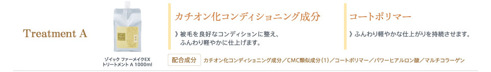 カチオン化コンディショニング成分(ふんわり成分)・CMC類似成分(1)(補修成分)・コートポリマー(仕上がり維持成分)・パワーヒアルロン酸(保湿成分)・マルチコラーゲン(保湿成分)